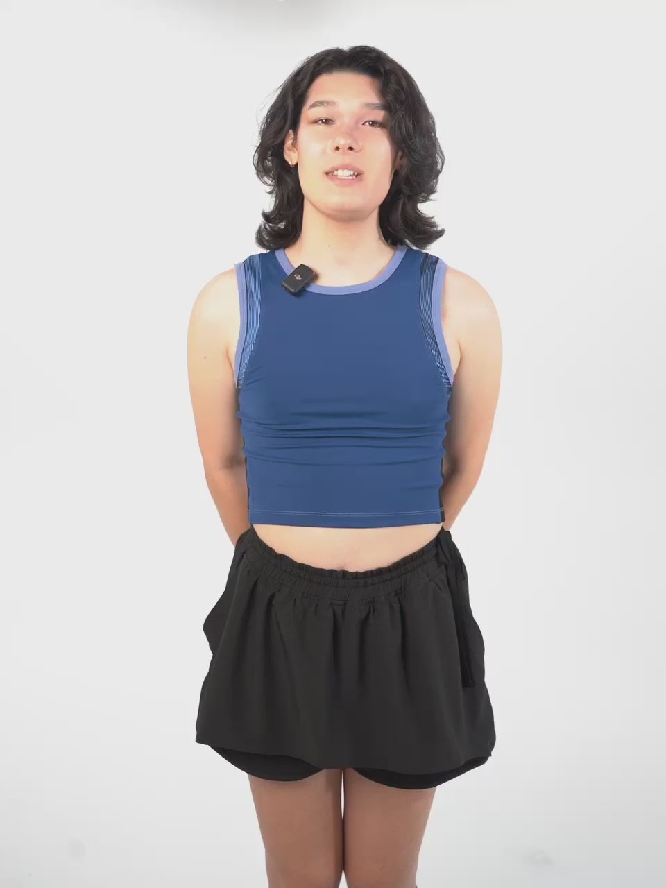 Designed for the coverage and versatility of a classic running short but the style and movement of a tennis skirt. Made from a light weight woven polyester, this skirt is bouncy, quick drying and almost weightless in use. A full layer of shorts keeps everything covered and protected while an additional outer skirt layer gives the garment dynamic movement. Features an elastic waistband and drawstring in addition to front pockets.